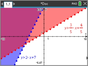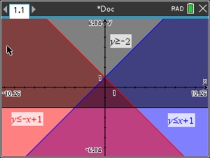 NOTE: If you previously used a TI-94+ CE graphing calculator, you know that it had a special feature that could shade only the solution area for a system of inequalities. It was listed under the title "Inequal Intersection". Unfortunately, the TI-Nspire CX II non-CAS does not offer such a build-in "intersection" feature. But, fortunately, the system graphs clearly show the intersection area.