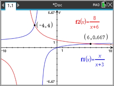 Hint:  When working with rational equations, it may be difficult to "see" the intersection point if the viewing window is a small representation of the graph.