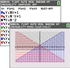 After entering the first inequality in the APP, arrow down, arrow left for box, ENTER, and begin the process again for the second inequality. When both are entered, hit GRAPH.